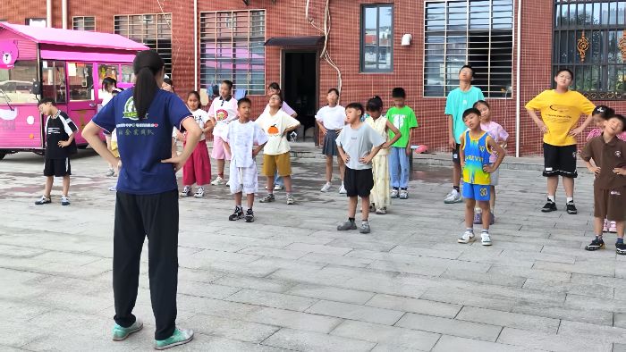 圖為志愿者帶領孩子們做熱身運動。林雨濤攝
