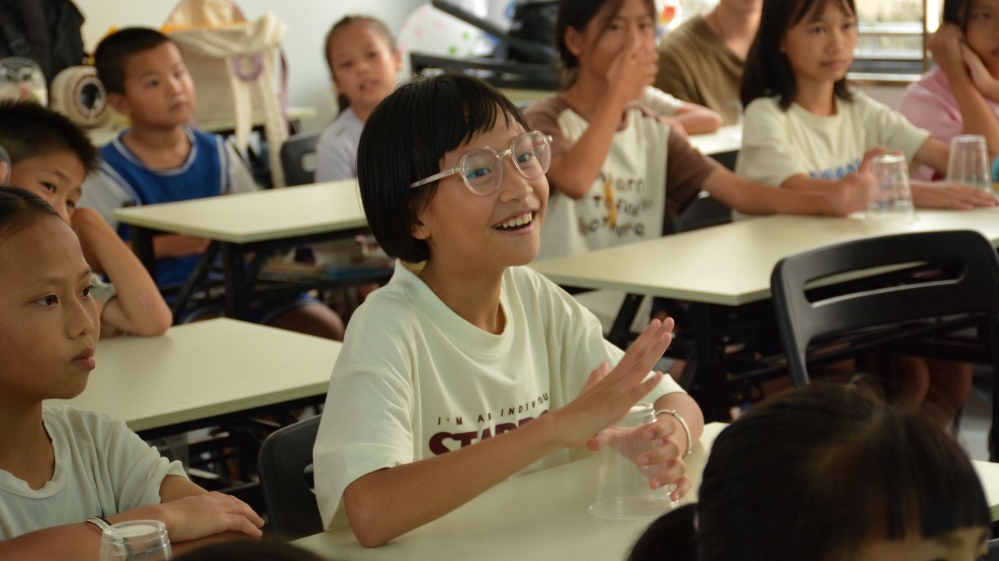 “大家看,這個動作像不像當年的游擊隊員在傳遞信號?”志愿者示范著將杯子從左手傳到右手,“南路的小交通員就是這樣悄悄傳遞情報的。”孩子們的興致一下子被點燃了。起初動作還生疏,節奏也零散,可聽著故事,手底下漸漸有了章法。9歲的吳麗燃起初總跟不上節拍,老師沒有批評她,而是給她講了遂溪少年阿明用敲竹板的方式給游擊隊報信的故事:“阿明一開始也敲不準,后來練了很多次才練熟。”吳麗燃點點頭,反復練習,終于在合奏時跟上了節奏,臉上露出燦爛的笑容。