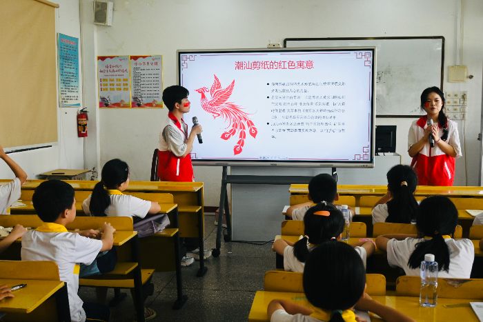 非遺探秘拓展認知。張佩麗老師的“潮汕非遺偵探社”課程中,孩子們化身“小小偵探員”,解析剪紙紋樣、破譯潮劇音調、解鎖英歌舞招式,深入研習英歌舞臉譜象征意義并繪制專屬臉譜,豐富了對地方非遺文化的認知。