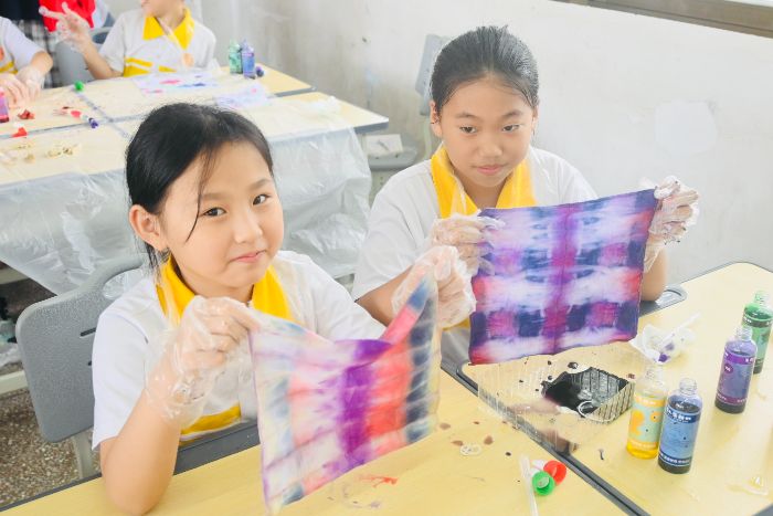 美育:提升審美能力,豐富文化感知 非遺技藝展魅力。梁梓悅老師的“彩韻扎染魔法站”手工實踐課堂,從普及扎染知識到示范核心技法,帶領孩子們親手創作,在藍白交織中感受非遺扎染的獨特美學。