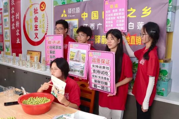 在產品推廣環節,實踐隊員們走進白蓮加工產品直播間,積極“變身”宣傳員,手持寫有產品優勢、吃法及品質保障的展示牌,向各地的網友們介紹公司白蓮等農產品。“敢承諾無任何添加、無熏硫”“支持運費險、試吃,7天無理由”,通過清晰的產品理念傳遞與略顯青澀但真誠的介紹,努力拓寬農產品推廣渠道,助力提升當地特色農產品的市場知名度 ,他們在鏡頭前賣力宣傳,在幕后幫忙剝蓮子,用實際行動助力農產品銷售,努力搭起消費者與產地之間的信任橋梁。