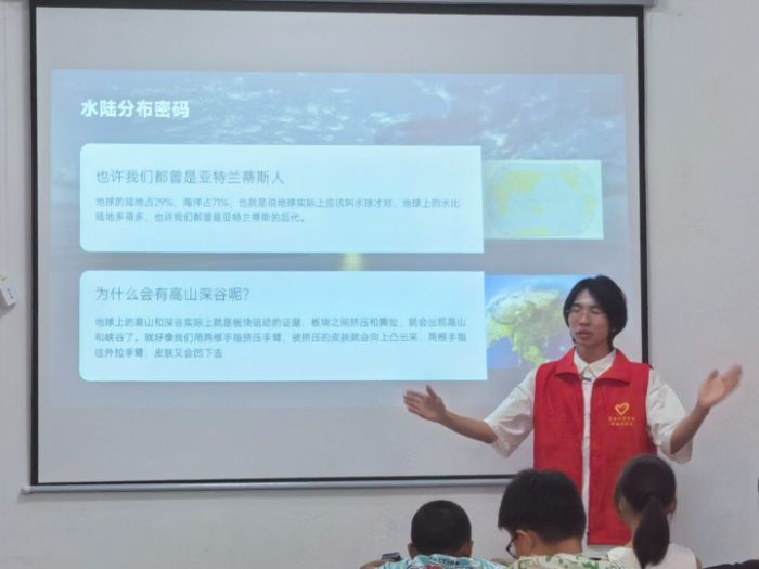 為激發(fā)孩子們的科學(xué)探索興趣,培養(yǎng)孩子們對(duì)課外知識(shí)的好奇心,7月9日上午,十堰市張灣區(qū)紅衛(wèi)街道周家溝社區(qū)愛心托管班里,一場(chǎng)精心策劃、妙趣橫生的天文科普課正在上演。湖北汽車工業(yè)學(xué)院“科普志愿服務(wù)隊(duì)”響應(yīng)“七彩假期”暑期社會(huì)實(shí)踐的號(hào)召,志愿者們?yōu)閻坌耐泄馨嗟耐瑢W(xué)們精心設(shè)計(jì)了課程方案,用通俗幽默的語(yǔ)言和分豐富多彩的圖片,直觀的向同學(xué)們講解天文知識(shí),帶領(lǐng)同學(xué)們跳出課堂,走進(jìn)豐富多彩的天文世界。