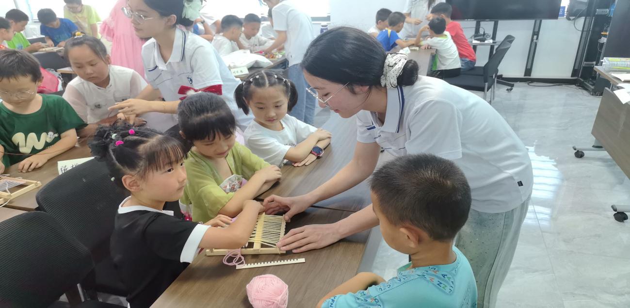 理論學習后,實踐環節熱鬧開啟。40名小朋友分成10組,每組在小老師帶領下,嘗試用簡易織布機織布。穿線、調整、推動梭子,看似簡單的動作,實操起來卻考驗耐心。有的小朋友因線纏在一起著急,小老師便蹲下身子,手把手教;有的成功織出一小段,興奮地舉給伙伴看。讓傳統紡織技藝從書本走進實踐,在孩子們心中播下探索非遺的種子。