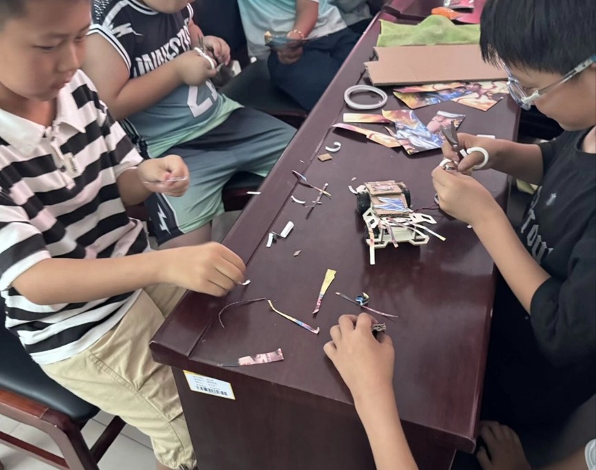 教室里,剪刀裁剪聲、膠帶撕扯聲與討論聲交織。孩子們為水火箭的尾翼角度爭論,為動力小車的輪軸平衡反復調試。原本廢棄的瓶罐,漸漸變成了帶著鄉土印記的“科學作品”——火箭箭體上畫著魚山輪廓,小車車身上貼著黃河波浪紋。