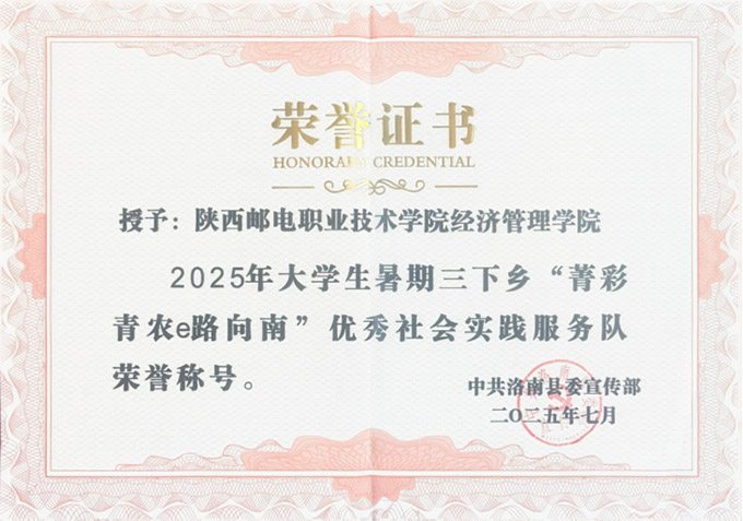 2025年6月30日至7月9日,陜西郵電職業(yè)技術(shù)學(xué)院經(jīng)濟(jì)管理學(xué)院“三下鄉(xiāng)”社會(huì)實(shí)踐團(tuán)赴商洛市洛南縣,以“文旅融合+數(shù)字賦能”為主題開(kāi)展暑期實(shí)踐活動(dòng)。在學(xué)院團(tuán)總支書記潘丹妮、教師喬曉娟、郝真的帶領(lǐng)下,10名學(xué)子通過(guò)校地協(xié)同、非遺調(diào)研、產(chǎn)業(yè)鏈研學(xué)、助農(nóng)直播等系列舉措,為鄉(xiāng)村振興注入青春動(dòng)能,團(tuán)隊(duì)榮獲中共洛南縣委宣傳部授予的2025年暑期“菁彩青農(nóng)e路向南”優(yōu)秀社會(huì)實(shí)踐服務(wù)隊(duì)稱號(hào),實(shí)踐成果獲洛南縣融媒體中心專題報(bào)道。