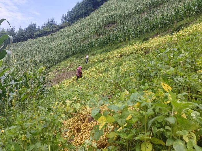 7月10日清晨七點四十分,吉惹進去、高叢莉等隊員背著背簍,沿陡坡向鄢家碉村的黃豆地進發。十五分鐘的山路里,小溪、石橋與沿途的玉米地,勾勒出彝鄉農耕圖景。抵達目的地時,45度的陡坡與混著碎石的泥土讓隊員們咋舌——高叢莉剛邁出兩步就需緊抓豆稈穩住身形,“光是站穩都這么難,作物咋生長啊!”