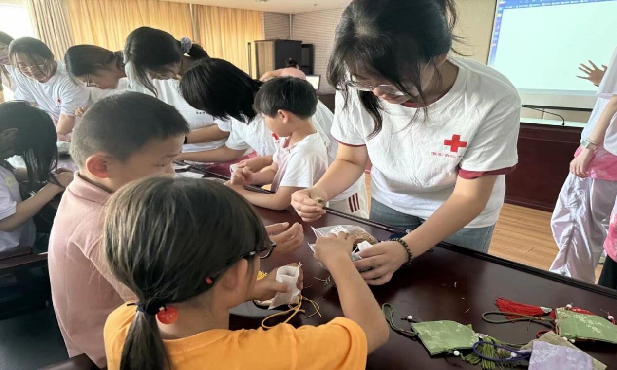 有了對藥材的認識,小朋友們就可以根據自己的需求開始做香囊了。志愿者們提前準備了袋子、香囊等材料,耐心地幫助孩子一起填充藥材、放入香包,系緊袋口。孩子們拿著香囊,在志愿者的手把手指導下,認真地完成屬于自己的第一個香包。指尖翻飛間,一個個帶著淡淡藥香的小巧香包逐漸成型,孩子們舉著自己的作品,臉上洋溢著自豪與喜悅。