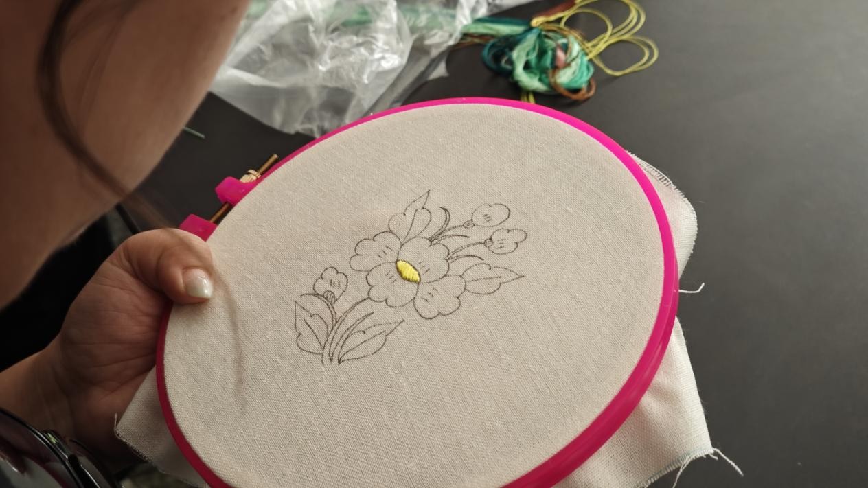 了解過苗繡的歷史與基本信息后,實(shí)踐團(tuán)成員從非遺傳承人手中接過特制的彎針與彩線,在土布上開啟了首次穿引。屏息凝神間,絲線的韌性質(zhì)感悄然傳遞著時(shí)光的重量。方寸布帛間,看似簡單的平針繡實(shí)則暗藏匠心。針尖時(shí)而偏離軌跡,絲線不時(shí)纏繞打結(jié),更有成員刺破手指仍專注于調(diào)整細(xì)密的針腳。布帛間沙沙的穿梭聲,成為此刻最虔誠的禮贊。當(dāng)親手繡制的山花輪廓在布面初綻,笑意點(diǎn)亮了年輕的臉龐。“一針一線皆功夫,方寸之間見史詩!”稚嫩的作品凝聚著專注的熱度,這堂生動(dòng)的非遺實(shí)踐課,已在青春的心間刻下深刻的文化印記。當(dāng)千年絲線纏繞年輕指尖,古老智慧與青春熱忱在細(xì)密針腳間交融,在傳承與創(chuàng)新的永恒命題中,悄然架起一座連接過去與未來的橋梁。