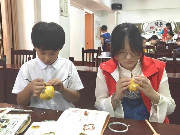 7月9日團隊成員陳雅楠主持展開“療愈心靈:手工漆扇制作”活動。他們備好空白漆扇、顏料等材料,指導孩子創作專屬漆扇。借手工創作傳遞“專注當下、接納自我”的心理療愈理念,讓孩子在動手間釋放壓力。