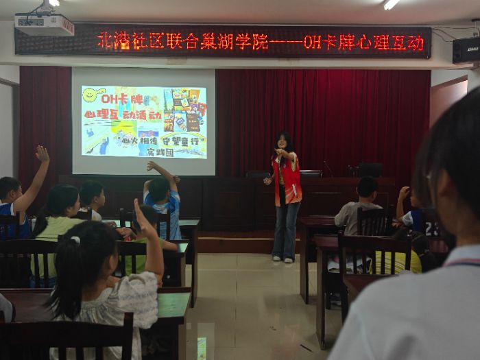 清晨八點,小朋友們迎著朝陽踏進教室。在完成兩小時的課業輔導后,一場別開生面的“OH卡牌心靈探秘”活動正式展開。五彩斑斕的卡牌在桌面上鋪開,孩子們輪流抽取圖案卡牌,將抽象的圖案轉化為充滿童真的故事,用自己的方式進行分享。孩子們通過卡牌演繹喜怒哀樂,實踐團成員們巧妙引導他們表達內心。活動結束時,孩子們依然沉浸于彼此分享的喜悅中。
