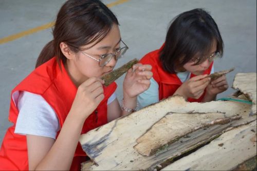 圖為筑夢團成員聞杜仲樹皮的藥香味蔣祺攝
