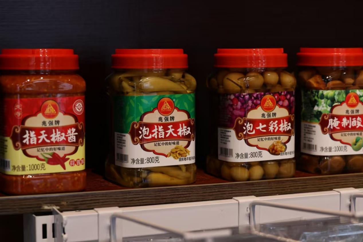踏入天等辣都形象店,實踐團成員便被豐富的辣椒產品吸引。在“兆強牌品嘗區”成員們駐足體驗,有的打開辣椒醬罐輕嗅香氣,有的拿起禮盒端詳包裝。展柜里,指天椒醬、泡指天椒、泡七彩椒等 20 余種“兆強牌”產品有序陳列,涵蓋調味、休閑食品等品類,直觀呈現當地辣椒產業深加工成果。