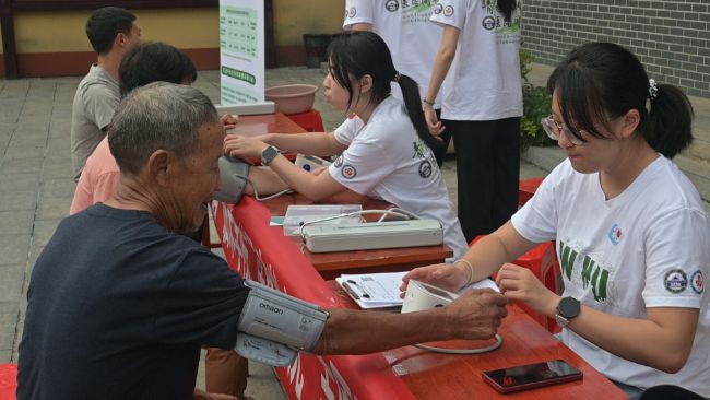 完成近20戶調研走訪后,實踐隊員們在黨員群眾服務中心前搭建了健康宣教義診點,分組為村民量血壓,測血糖,同時分發健康手冊并結合“全民減重”政策進行慢性病預防科普。“血壓135/85,稍微有點高,平時少喝點咸菜湯就行。”“血糖控制得不錯,記得按時吃降壓藥。”一句句接地氣地叮囑,把復雜的醫學知識化作日常提醒。那本密密麻麻的健康檔案,已悄然成為這座村莊未來精準幫扶的第一份“健康地圖”。