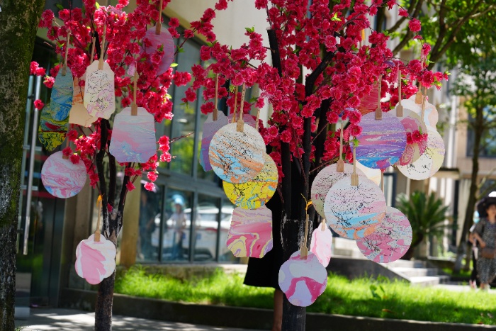漆扇制作課上,實(shí)踐團(tuán)成員用PPT展示漆扇歷史后,孩子們圍站在桌前,用天然顏料在素白扇面上創(chuàng)作,將扇子放入水中,以點(diǎn)、甩、彈、劃等手法,在水面繪出圖案效果,再暈染在扇面,形成妙趣橫生、自然天成的圖案,每一把都是獨(dú)一無(wú)二的藝術(shù)品。“想畫(huà)四面山的瀑布,這樣不僅美觀,媽媽干活累了可以為她扇風(fēng)。”8歲的小朋友專(zhuān)注地給扇面涂著藍(lán)色,顏料沾到指尖也不在意。舉著晾干的作品說(shuō):“原來(lái)這就是非遺,真有趣。”