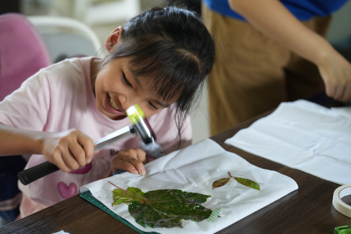 拓染,又叫捶草印花,是一種取之自然、美化服飾的印染方式。在植物拓染活動(dòng)里,孩子們收集樹(shù)葉、花瓣,用小錘輕敲固定在白布上。“看,這片銀杏葉的紋路像小扇子。”孩子們看著白布上浮現(xiàn)的葉片輪廓,驚喜地拍手。“捶、印、草、花”一個(gè)字就是一種工序、一幅畫(huà)面,當(dāng)它們組合在一起,又是一個(gè)故事,一種情懷。實(shí)踐團(tuán)通過(guò)這種方式,讓孩子們感受自然之美與非遺技藝的融合。