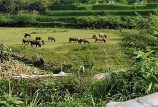 圖為傍晚巴澤梯田下的水牛