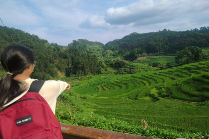 16日上午,團隊驅(qū)車前往巴澤梯田。當(dāng)車子穿越層巒疊嶂,一幅由綠色的畫卷漸次展開,梯田在云霧里若隱若現(xiàn),如巨龍盤踞山間。站在觀景臺俯瞰,1000余畝梯田自山腳綿延至云端,層層疊疊如天階垂落。