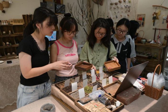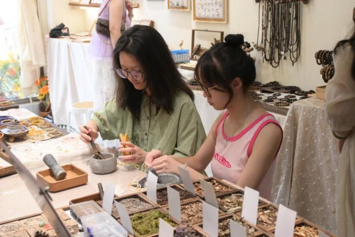 在制作過程中,隊員們一邊操作一邊向鋪主請教傳統香囊的制作技巧,同時也分享了現代藥學對藥材功效的研究成果。隨后,他們帶著親手制作的香囊走向街頭,贈予當地居民,并耐心講解每種藥材的作用:“薰衣草能舒緩情緒,合歡花可以安神解郁,石菖蒲能開竅豁痰……”此外,隊員們還示范了香囊的使用方法,建議將其放置在床頭或隨身攜帶,幫助改善睡眠質量。