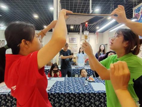 熏畫,作為延安非遺的重要組成部分,其制作過程充滿了獨特的藝術魅力。在民藝館的工作室內,張寧老師為團隊成員詳細拆解了熏畫的制作步驟。從宣紙的熏制到上色的技巧,每一個環節都蘊含著匠人的智慧與耐心。團隊成員在老師的指導下,親手嘗試了熏制與上色過程,盡管起初手法生澀,但通過反復練習,逐漸掌握了技巧。當一幅幅帶著古樸質感的熏畫在手中誕生時,成員們不僅感受到了非遺技藝的精妙,在大家親歷了熏畫從無到有的全過程,真切觸摸到了非遺的肌理,更將“耐心”與“專注”深深烙印在心中。
