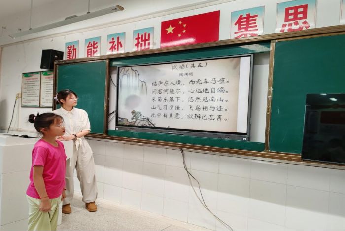 圖為在詩詞朗誦課堂上的詩詞朗誦。支教隊員聲情并茂地引導孩子們領略古詩詞的魅力,孩子們在抑揚頓挫中體會文字之美,讓傳統文化的種子悄然在心間生根發芽。竇天梓攝