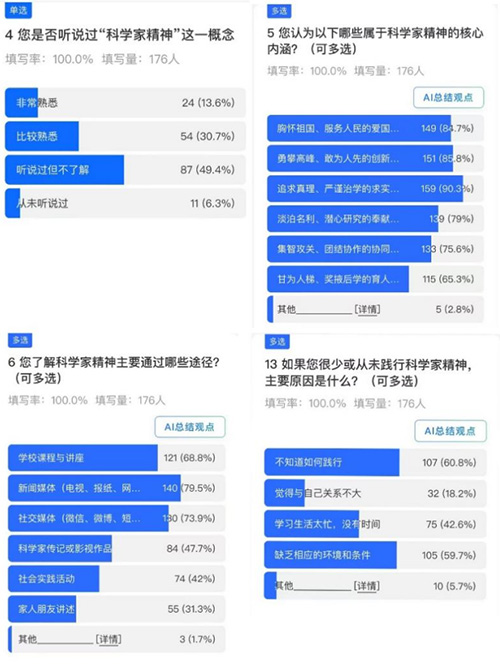 問卷研磨,勾勒認知輪廓 6月30日,黃山市圖書館里,實踐團成員們開啟“頭腦風暴”。為精準捕捉高中生對科學家精神的認知,團隊分工協作,從問題邏輯打磨到問卷發布渠道規劃,反復推敲。“這不僅是一份問卷,更是打開高中生科學家精神認知世界的鑰匙。”隊長程希恩說道。后續通過社交平臺、高中渠道發布電子問卷,回收的176份有效問卷,如同一幅“精神地圖”,呈現出高中生對愛國、創新、求實等科學家精神核心內涵的理解,也為后續活動錨定方向。