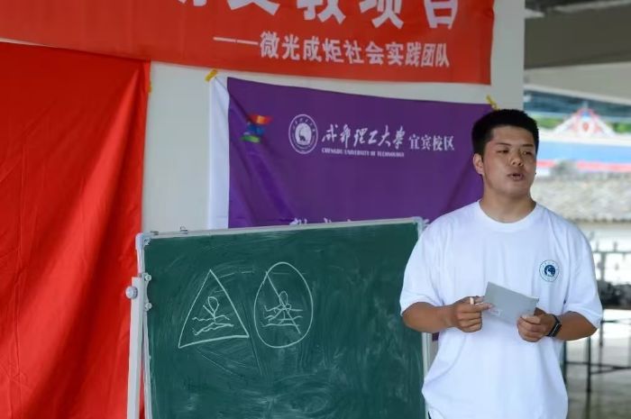 隨即,由團隊成員胡富聰和高俊陽為孩子們帶來了一堂別具一格的“炬守微光—安全教育課”。課程內容豐富實用:防溺水環節,支教隊員首先拋出“如果看到小伙伴落水,你們該怎么做?”問題,孩子們紛紛舉起小手積極回答。通過情景模擬,志愿者們向孩子們講解了野泳的危險性、溺水自救技巧以及救援原則;山體滑坡避險模塊以隊員胡富聰的自身經歷為鑒并手繪山體構造圖,描繪泥流走向,識別危險,牢記避險口訣并沿垂直方向跑向高地。垃圾分類學習環節則通過互動游戲展開,將畫著電池、果皮等圖案的卡片投入對應分類箱。得分最高的小組獲得了用回收塑料瓶改造的筆筒獎品。課后,孩子們不僅自發繪制分類桶監督投放,更用響亮的普通話回應收獲:“垃圾分類,人人有責。”支教團隊還留下了教學手冊和物資,致力于幫助小孩子形成安全意識。