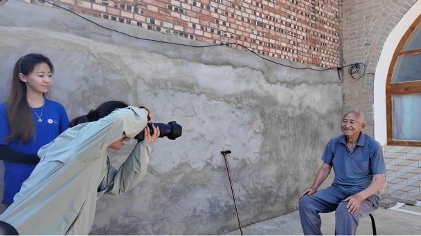 在高西溝村,隊員們首先參觀了高西溝博物館與小米博物館,領會“奮斗和傳承”的精神內涵,深刻貫徹“綠水青山就是金山銀山”的理念。隨后隊員們入戶開展攝影公益活動,他們為老人拍攝照片,大家耐心地幫助老人整理衣著、妝容,用親切的話語與老人交流,如詢問老人的生活趣事、子女情況等,讓老人放松心情,展現自然的笑容,根據老人意愿,拍攝了單人照、夫妻照等,努力彌補歲月遺憾,搭建起情感溝通的橋梁。