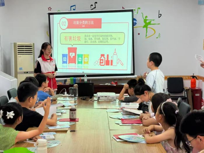 環保理念,是引領青少年走向綠色未來的行動指南。“垃圾分類科普”活動中,實踐團通過展板、視頻等形式,詳細講解垃圾分類的重要性、四分法、投放方法以及臭氧的作用與保護方式。看著孩子們認真聆聽,積極提問,對環保知識有了更深入的了解,我們相信環保理念已在他們心中扎根,他們將成為環保的倡導者和踐行者,為社區的綠色發展貢獻青春力量。