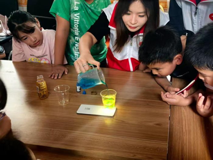 科學探索,是點燃青少年智慧之光的璀璨火花。“七彩假期”科學實驗課上,看著孩子們化身為小小科學家,積極參與“螢火流星雨”“奇幻熔巖燈”等精彩實驗。實踐團結合實驗現象,深入淺出地講解科學原理,希望能激發孩子們對科學的好奇與熱愛。看著他們在觀察中思考,在思考中成長,觀察力和邏輯思維能力得到充分鍛煉,我們知道這為他們未來的科學探索之路奠定了堅實基礎。