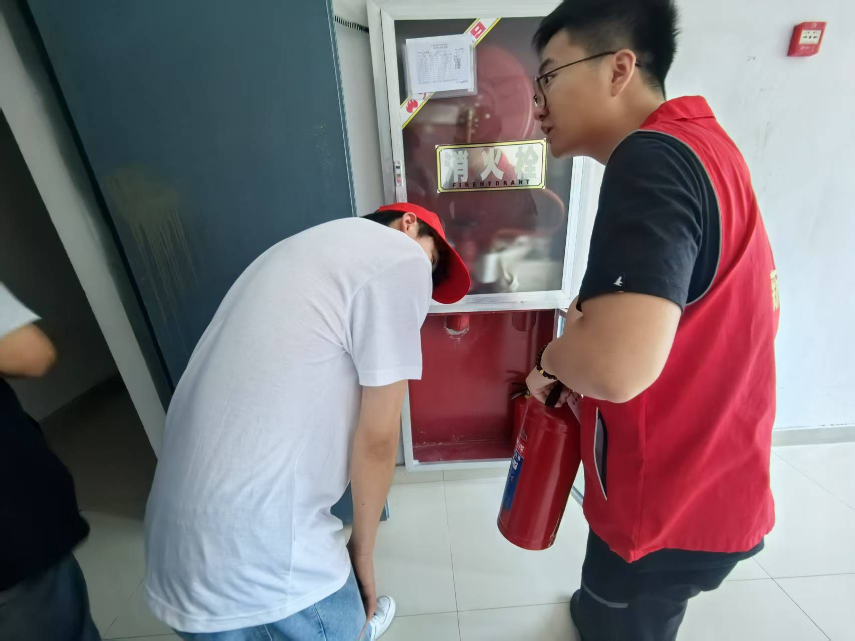 墻面上"消火栓 FIRE HYDRANT"的雙語標識在陽光下格外醒目,實踐團用這場"沉浸式"檢查,讓消防安全從標語變成了居民觸手可及的責任。