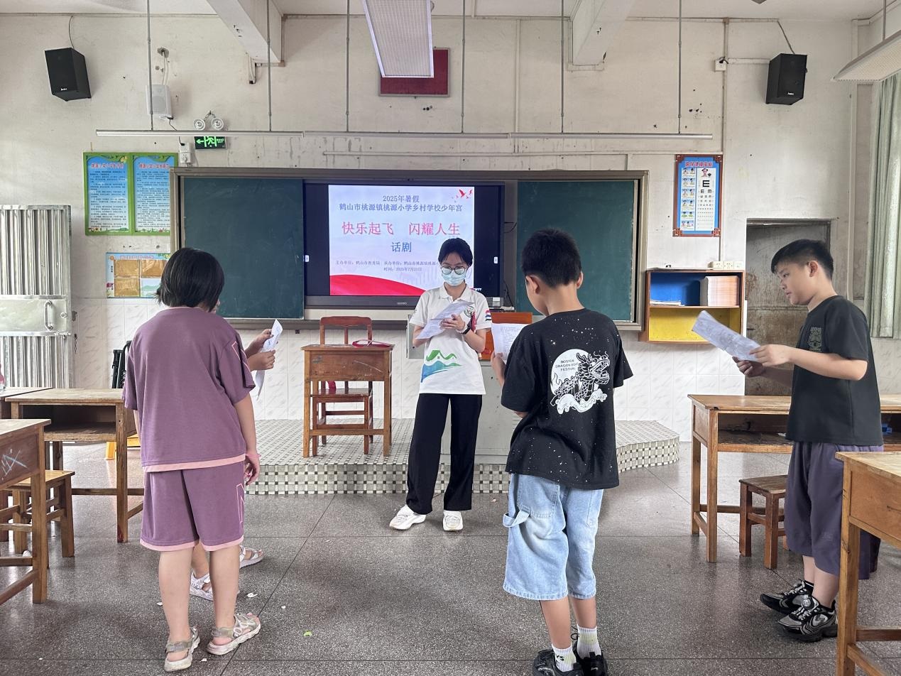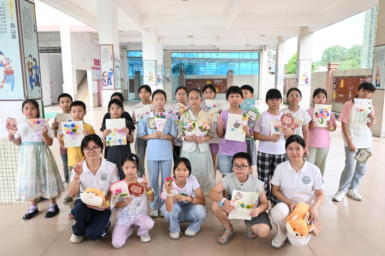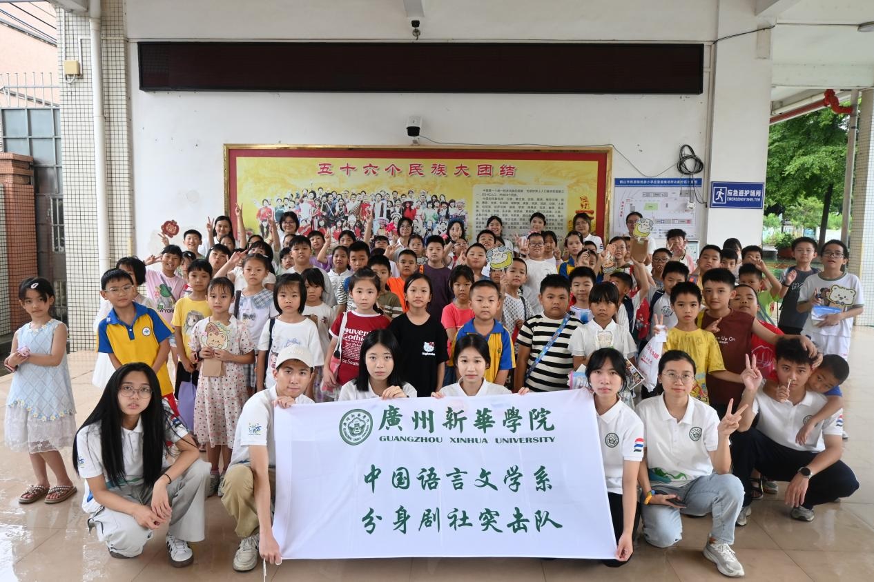 為深入貫徹國家《“十四五”鄉村教育振興行動計劃》中“推動優質教育資源下沉鄉村”的部署,響應共青團中央“三下鄉”社會實踐號召,2025年7月16日至7月23日,廣州新華學院中文系分身劇社突擊隊深入廣東省鶴山市桃源鎮桃源小學,開展了為期八天的“藝術侵潤童心”美育支教活動。盡管面臨臺風和暴雨的雙重考驗,團隊仍以靈活調整和加倍熱情,通過系統化的書法、手工、話劇、繪畫、朗誦藝術課程設計,為孩子們帶來了一場難忘的,充滿韌性、創意與溫情的美育之旅。