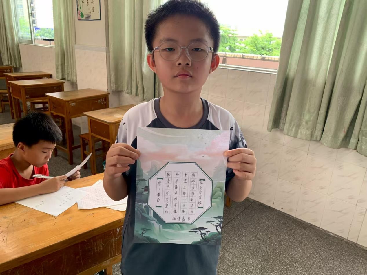 書法課則聚焦匯演展示作品,選定古典詩歌《早發白帝城》等作為主題。老師們以重點字為例教授學生偏旁部首的規范書寫以及漢字的間架結構,提升其對字形的整體把握能力。同時兩位教師一一對學生的練習進行面對面指導與糾正。值得一提的是,有三名學生主動要求加練,這讓老師們倍感欣慰。