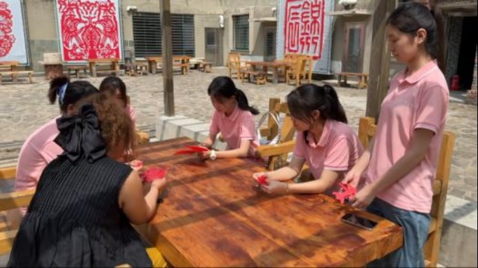 手藝人攜手成員們在古樸院落開展“剪紙技藝學習與民俗故事挖掘”活動。大家圍聚木桌,跟著手藝人學折疊——手藝人逐個糾正折痕角度,用指尖壓實邊角;教握剪時強調“拇指穿圓環、食指抵刀背”,演示“直線平剪、曲線轉剪”,見人下剪過深便輕扶手腕調整力度。通過實踐,大家掌握了剪紙技法,理清了非遺脈絡,既為鄉村非遺注入青春動能,也收獲了傳統技藝實踐經驗,實現了非遺傳承與個人成長的雙向賦能。