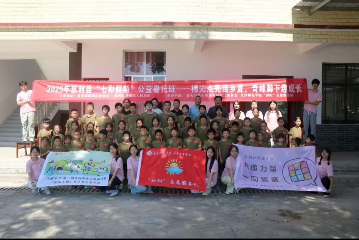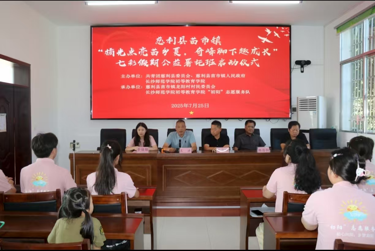7月25日,共青團慈利縣委員會、苗市鎮人民政府、龍陽村村民委員會聯合長沙師范學院初等教育學院“初陽”志愿服務隊共同舉辦的為期十五天的“橘光點亮苗鄉夏,奇峰腳下趣成長”七彩假期公益暑托班活動正式開班,本次活動旨在為苗市鎮龍陽村及周邊的留守兒童、困境兒童等群體打造一個集“知識學習、文化浸潤、安全守護、快樂成長”于一體的暑期學習成長平臺。
