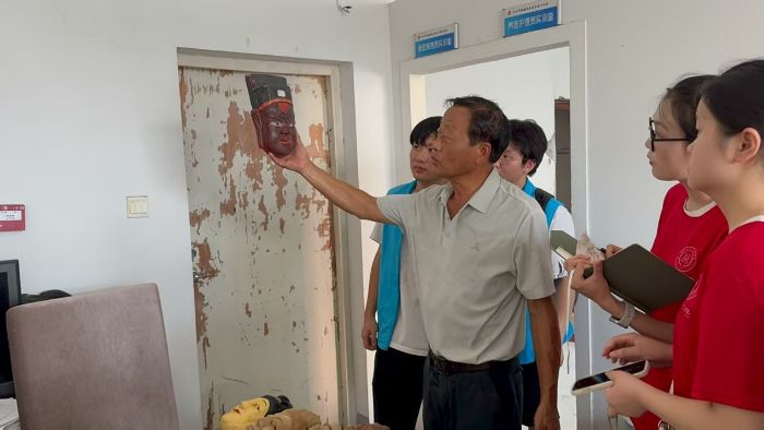 經(jīng)過山路的崎嶇我們來到了最后一站—劉街社區(qū)。在這里黨委副書記許鑫磊帶我們走進(jìn)了儺文化展示館,在他包含熱情的講解聲中我們?cè)俅紊钊肓私鈨幕刑N(yùn)含的鄉(xiāng)土情懷。許書記的目光中流淌著對(duì)未來的深切期待:“非遺的生命力在于傳承,更在于被看見、被理解、被熱愛。”他熱切望向在場(chǎng)的大學(xué)生們,言辭間充滿憧憬:“我們渴望儺戲走進(jìn)大學(xué)校園,讓年輕一代成為文化基因的‘解碼者’與‘創(chuàng)作者’。大學(xué)是思想碰撞的沃土,我們期待在這里孵化更多元化的表達(dá)形式。”許書記的愿景清晰而堅(jiān)定,他們希望大學(xué)不僅是知識(shí)的殿堂,更成為非遺文化擁抱未來的橋梁。讓儺戲在這里生根發(fā)芽,讓更多人在校園的走廊、屏幕的像素間、創(chuàng)意的碰撞中,為這千年藝術(shù)駐足、傾聽、共鳴。最終,讓儺文化不再是博物館的標(biāo)本,而是活在當(dāng)代人呼吸中的文化脈搏。這場(chǎng)對(duì)話中,傳統(tǒng)與現(xiàn)代的握手,正在書寫儺戲嶄新的生命力傳奇。