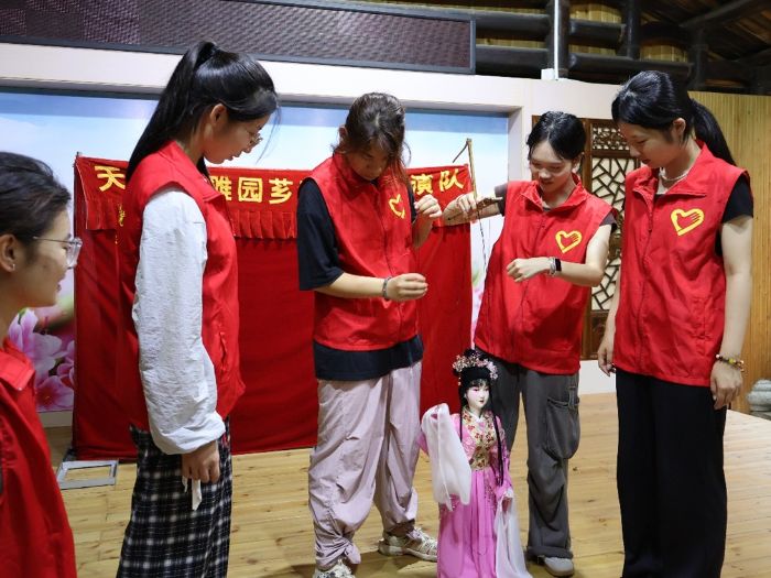 非遺文化體驗是此次“三下鄉(xiāng)”實踐的重點環(huán)節(jié)。隊員們首先觀摩了國家級非物質(zhì)文化遺產(chǎn)——漳州提線木偶的精彩表演,近距離感受了藝人憑借指尖巧技賦予木偶生命的獨特藝術(shù)魅力。隨后,實踐隊隊員們還向老師請教學(xué)習(xí)甩袖技巧。看似簡單的一個小動作,實則需要精準(zhǔn)把控手腕力度與絲線角度。老師手把手指導(dǎo),從握線講起。起初絲線纏結(jié),衣袖不聽使喚,經(jīng)反復(fù)練習(xí),木偶衣袖終于劃出優(yōu)美弧線。隊員們笑逐顏開,真切體會到非遺技藝的艱辛與奇妙,感受文化傳承的重量。