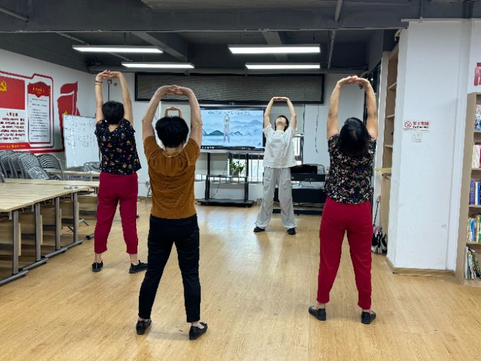 "起勢,雙手托天理三焦……"在志愿者的帶領下,多位老人整齊列隊,認真學習八段錦。考慮到老年人身體特點,學生們放慢動作節奏,并走到老人身邊手把手糾正姿勢。"這些孩子教得真耐心,八段錦練完渾身舒坦!"70歲的李奶奶笑著說道。