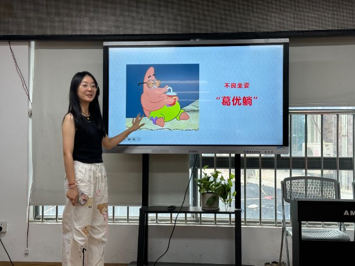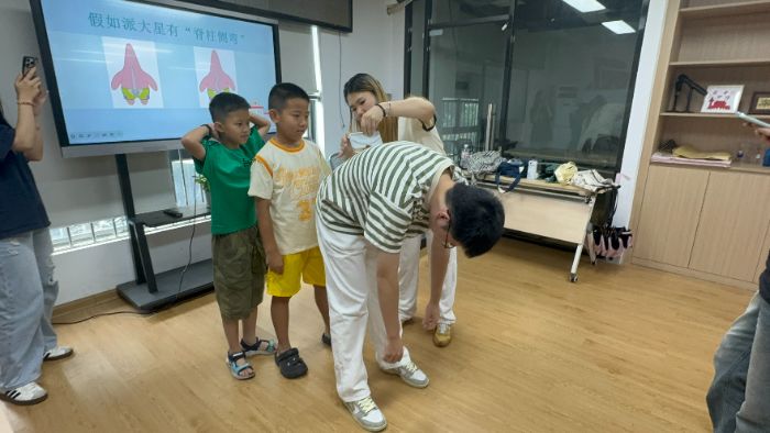 活動伊始,志愿者們以“我們的脊梁朋友”為主題展開科普宣講。他們用生動的動畫短片展示脊柱的結構,將頸椎、胸椎、腰椎比作“堆疊的積木”,形象解釋“為什么坐直了才舒服”。“如果長期歪著坐,脊柱就會像被掰彎的吸管,再也變不直啦!”志愿者李同學的比喻讓孩子們恍然大悟,紛紛挺直小身板,現場模仿起“標準坐姿”。