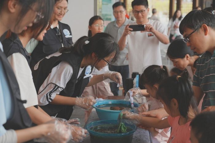 專人講解歷史淵源與工藝特色,讓參與者明了其“省級非遺”的獨特地位;指導親子家庭親手染制方巾,在指尖實踐中感受“天然染制”的魅力;直播與拍攝記錄活動全程,3萬余點贊量與本地社交平臺討論,擴大了地域影響力;晾曬間隙的知識問答,強化了公眾對“墩頭藍與其他藍染的區別”“天然染料環保價值”的認知。