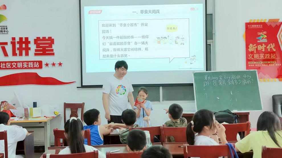 “零食選擇”課堂則通過沉浸式體驗深化認知。課前“我最愛的零食”互動點燃大家的參與熱情,孩子們展示自帶零食飲料,為后續學習埋下伏筆。營養標簽解讀環節極具視覺沖擊力——薯片脂肪含量以油勺量化(6勺油/100克),辣條鈉含量換算成鹽勺(近一日推薦量),果味飲料糖分用方糖堆疊(10塊方糖/瓶),直觀的數據讓“隱形風險”更加具象化,給兒童們留下了深刻的印象。