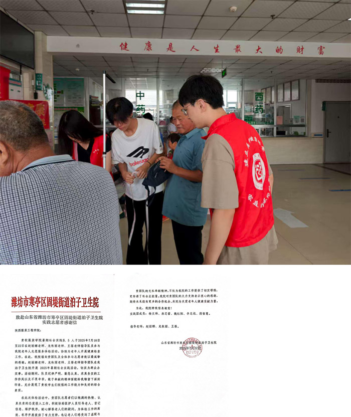 2025年7月18日至2025年7月22日,該校“三下鄉”學生團隊走進寒亭區泊子街道泊子衛生院,組織開展了以老年人志愿服務為主題的"三下鄉"活動。考慮到農村老人常見健康問題,體檢項目涵蓋血壓、血糖、心電圖、視力、聽力等基礎檢查,還針對關節炎、心腦血管疾病等老年高發疾病設置專項咨詢。服務隊隊員們提前學習當地方言,用通俗易懂的語言講解檢查流程,讓老人們倍感親切。活動在小組成員的有序組織下順利推進,小組成員幫助醫護人員記錄老年人身體狀況,取得良好社會反響。縣內受體檢老人的也積極配合為活動有序開展打下了基礎,也讓實踐過程更溫暖。