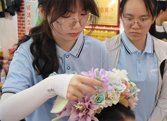 古厝海風探非遺,簪花技藝話傳承。團隊調研與攝影組首站來到蟳埔村,在古厝與海風的環抱中,沉浸式感受簪花文化的獨特韻味。成員們用鏡頭細致記錄下簪花從原料處理到造型完成的每一個環節,定格傳統工藝的細節之美。同時,大家在村里發放調研問卷,圍繞游客對簪花文化的認知度、體驗意愿等收集信息,為非遺傳播和產業發展積累數據。團隊還走訪了村內的簪花體驗館及店鋪,了解從生產制作到銷售體驗的完整業態鏈條,并專訪了“蟳埔女習俗”國家級非遺傳承人黃晨老師。交流中,黃老師分享了在技藝保護、文化傳播方面的思考,以及讓簪花文化融入現代生活的探索,讓成員們深深感受到傳承人對傳統的堅守與創新的決心。為更好傳承簪花技藝,可建立傳習所邀請黃晨等傳承人定期授課,同時開展進校園活動讓青少年近距離接觸;也可在保留傳統樣式基礎上,設計簡約款簪花飾品,滿足年輕人日常佩戴需求,拓寬消費場景。