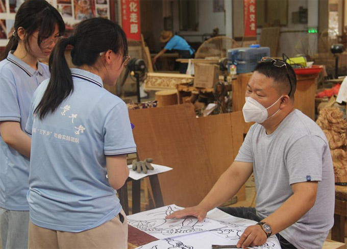 木雕古韻浸鄉野,青年聚力興潘山。團隊深入東石鎮潘山村,調研木雕文化的普及率與產業影響力。走訪中發現,木雕技藝在村里有著深厚的歷史根基,從傳統民居的雕刻裝飾到村民的就業選擇,非遺元素已深度融入鄉村生活。攝影組拍下了村落中與木雕相關的建筑與裝飾,生動展現出木雕文化與鄉村社會的緊密聯系。政府的非遺工坊扶持、文旅項目培育等政策,也為產業發展提供了制度支持。之后,團隊與潘山村村委會展開專題交流,梳理總結前期調研中發現的非遺產業發展問題。帶我們參觀了村落全貌后,村委會書記在訪談中指出,年輕人,尤其是大學生,是當前鄉村振興的關鍵因子。“我想鄉村振興還是要這一塊……農村最缺的就是引進來的人才,還有本土的。現在只有讓年輕人動起來了,社會才有希望。”如同書記說的,成員們也思考了對應的解決方案;為鼓勵更多年輕人回潘山村發展,可聯合當地企業推出“青年木雕人才計劃”,提供免費技藝培訓和創業扶持,如減免初期廠房租金、提供小額貸款擔保;還可打造“木雕主題鄉村創客空間”,引入電商運營、新媒體推廣等配套服務,幫助年輕人將木雕技藝與現代商業模式結合,實現多元發展。