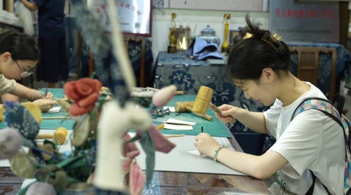 在南通藍印花布博物館,經工作人員指導,隊員們親身體驗了制作花版、刮漿、染色、晾曬、刮去防染粉的全過程。當藍底白花的紋樣最終“破繭而出”時,隊員們深刻感受到傳統工藝的魅力。博物館的建立與體驗課程的開設,是藍印花布從染坊走向大眾、實現活態傳承的重要舉措,有效促進了公眾對這項非遺文化的了解和認同。