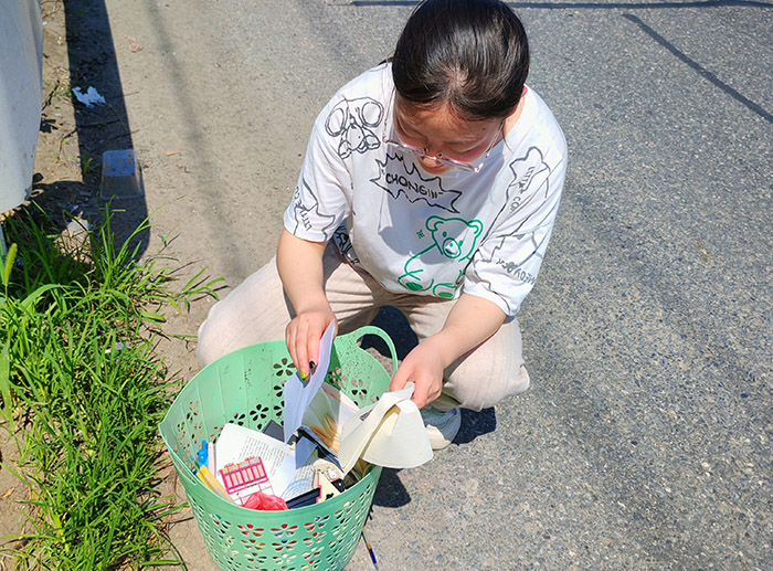 糧食安全講座結束后,小隊隨即開展了垃圾分類的宣傳與實踐。團隊成員懷抱宣傳資料,穿梭于村舍之間,將資料發放到村民手中,并耐心講解垃圾分類的必要性與重要性。面對部分村民提出的“麻煩”等質疑,他們耐心解釋可回收物的經濟價值和有害垃圾的環境危害,努力讓宣傳冊上的知識走進村民心里。