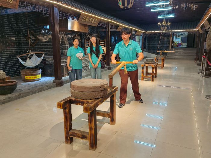 7月9日上午,在八公山豆腐主題文化園,團隊系統(tǒng)調(diào)研了豆腐制作技藝這一國家級非遺。從西漢淮南王劉安煉丹偶得豆腐的傳說,到浸泡、磨漿、濾漿、煮漿、點鹵等一系列傳統(tǒng)工藝步驟,再到現(xiàn)代機械輔助研磨的應(yīng)用,隊員們見證了豆腐文化跨越千年的傳承與演變。