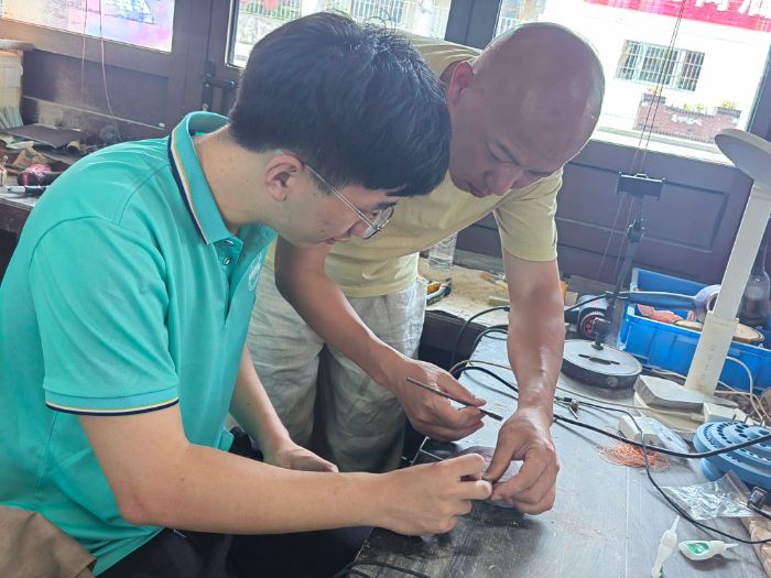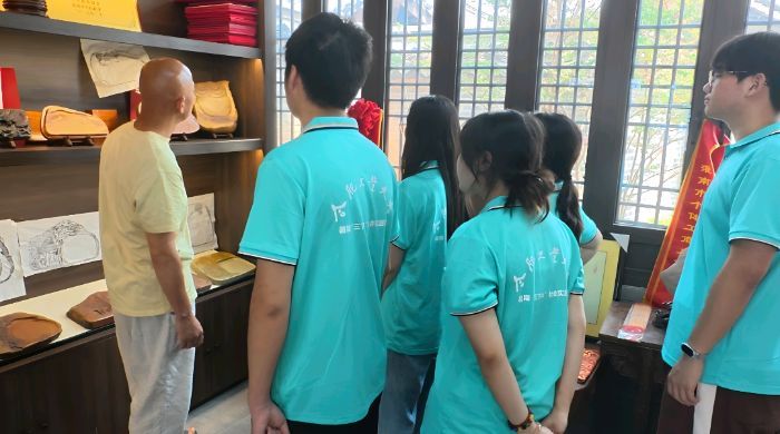 7月7日上午,團隊來到紫金硯馮長文大師工作室。雖然紫金硯本身并非食品,但其承載的匠心精神,文化內(nèi)涵與創(chuàng)新路徑為食品學(xué)子帶來深刻啟發(fā)。馮師傅現(xiàn)場演示了“相石—設(shè)計—雕刻—打磨”的全流程,其行云流水的刀法令隊員們嘆為觀止。并且馮師傅“每一刀都要順應(yīng)石紋”的技藝,類比于食品加工中尊重原料特性的重要性。