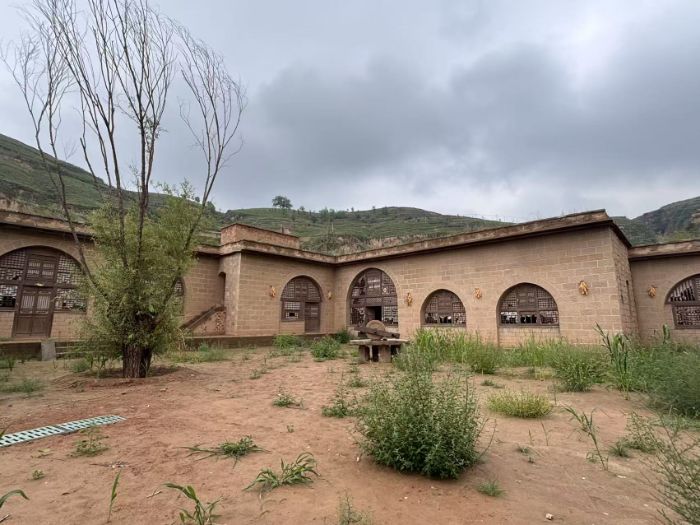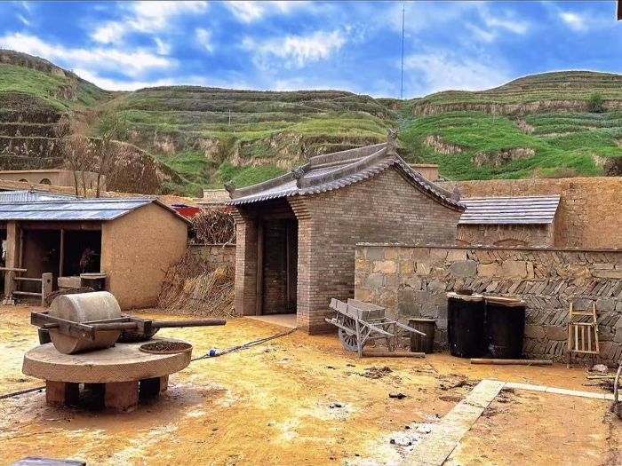 群山環抱間,孔孔窯洞依山勢錯落。雖為新建,其頂尖仿舊工藝所達到的逼真程度令人嘆服——斑駁的墻面、風化的棱角、精心營造的使用痕跡、乃至門窗木料的老化質感,在陽光下沉淀出跨越數十載的厚重滄桑。點綴其間的磨坊與馬棚,堪稱點睛之筆,完整復現了歷史生活場景:磨坊里靜臥的石磨盤仿佛殘留著勞作的余溫;馬棚中粗糲的拴馬樁、磨損的草料槽。與我們日常居住的現代窯洞相比,這里刻意“做舊”的群落,反而更極致地”原了革命年代艱苦樸素的原貌。