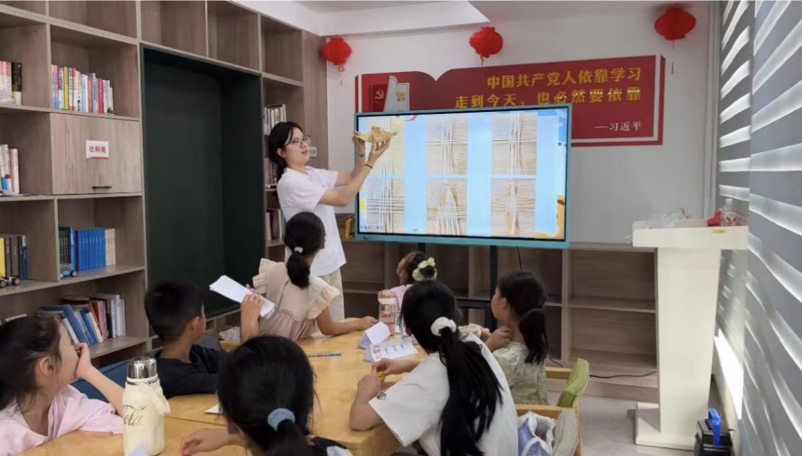 廣德素有“中國十大竹鄉(xiāng)”之一的美譽。團隊成員立足這一特色,將國家級非物質(zhì)文化遺產(chǎn)——廣德竹編引入課堂。在一名隊員的講解與示范下,孩子們認識了竹編的工具與基本技法。動手環(huán)節(jié),孩子們在隊員們的耐心指導下,嘗試用細薄的竹篾編織小船。從最初的生疏、竹篾不聽使喚,到逐漸掌握技巧,指間翻飛,一艘艘形態(tài)各異的竹編小船陸續(xù)成型。“老師,你看我的小船能浮起來嗎?”一位小男孩興奮地展示自己的作品,不少孩子意猶未盡,主動要求嘗試編織第二件作品。這堂沉浸式的非遺體驗課,讓孩子們零距離感受到家鄉(xiāng)傳統(tǒng)文化的魅力,動手能力與專注力得到鍛煉,文化傳承的種子悄然播下。
