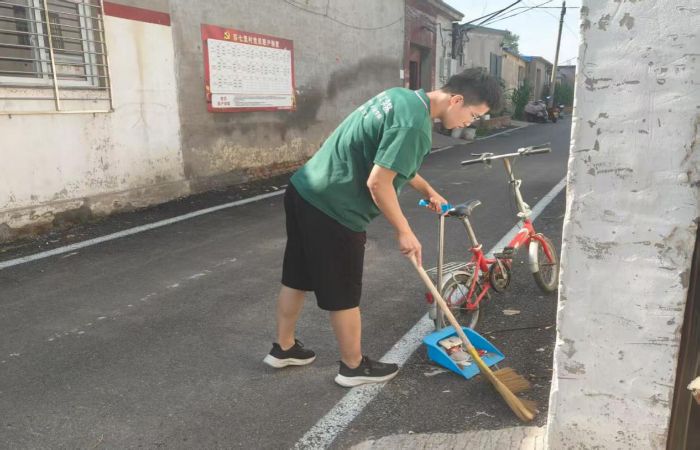 圖為實(shí)踐隊(duì)員在打掃蘇七里村主干道路。謝昂帆通訊員攝